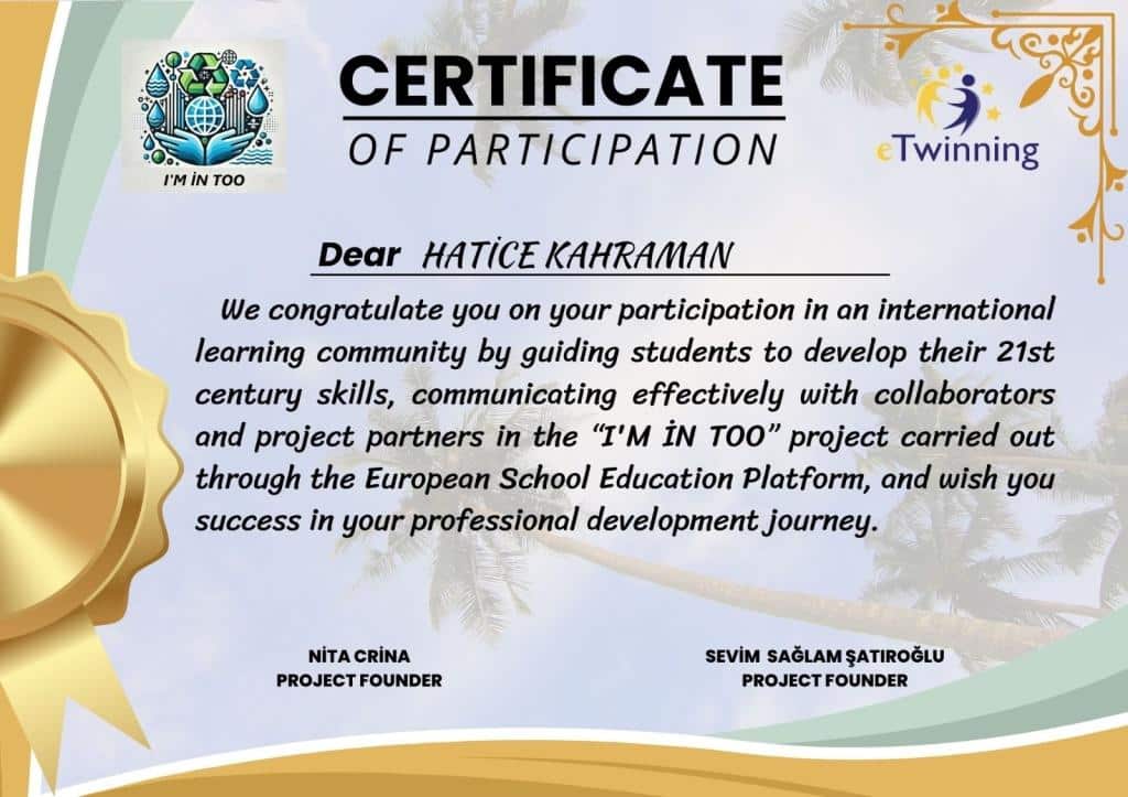 Okulumuz öğretmeni Hatice Kahraman tarafından yürütülen etwinning projemiz " I'm İn Too (Ben de Varım) " kapsamında ;