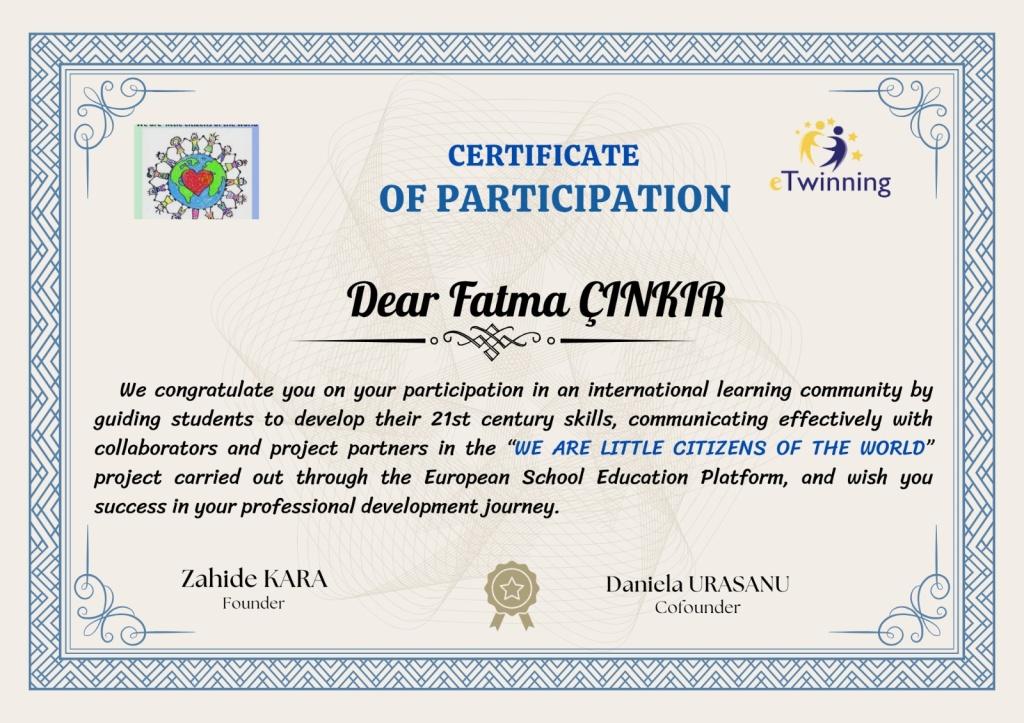 Okulumuz öğretmenlerinden Fatma ÇINKIR ve Hatice KAHRAMAN tarafından yürütülen etwinning projemiz "We Are Little Cıtızens Of The World ( Biz Dünya 'nın Küçük Yurttaşlarıyız )" eTwinning projemiz kapsamında öğrencilerimizle birlikte ;